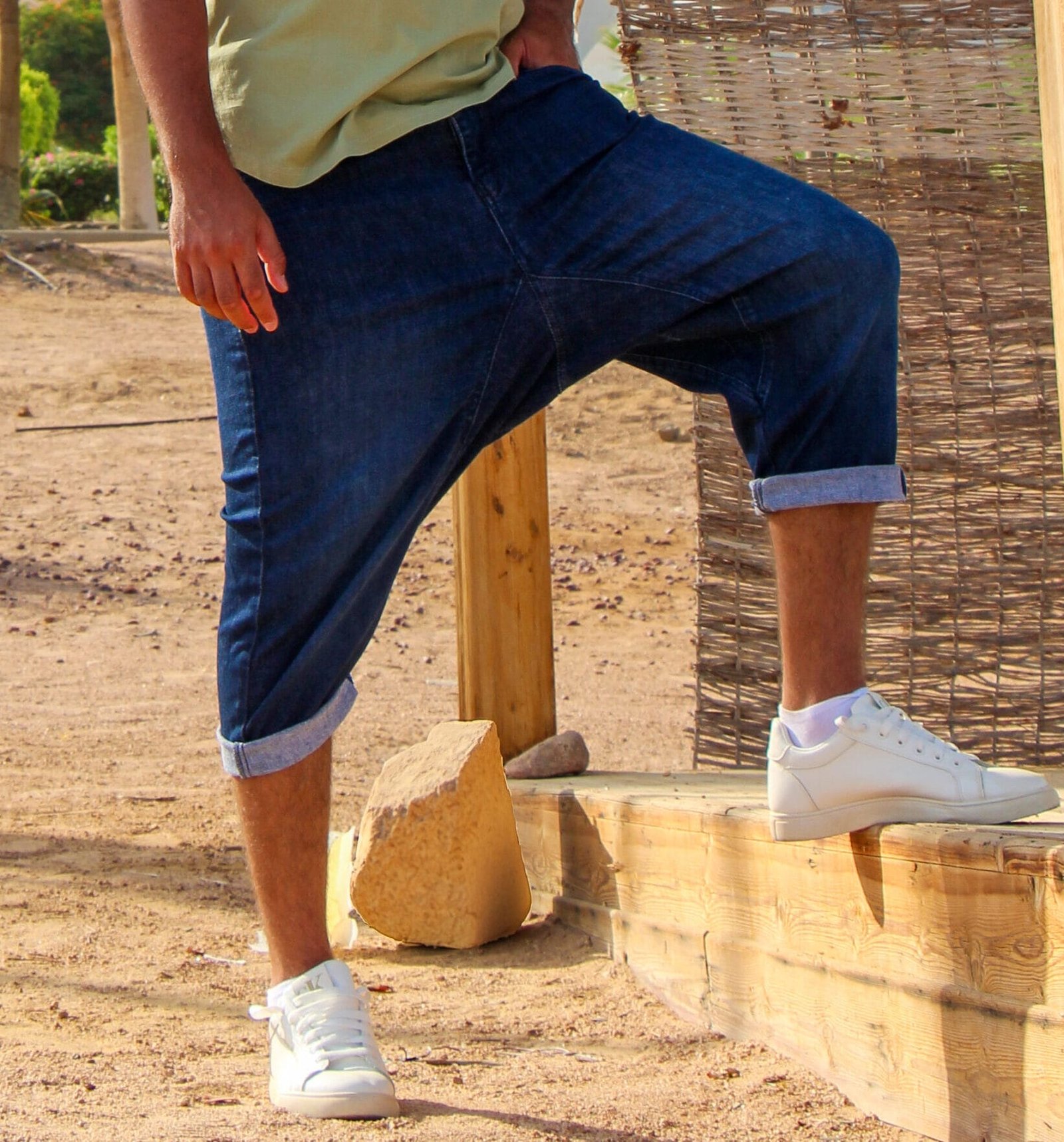 Découvrez le pantacourt homme en jean revisité, inspiré du traditionnel serwal.